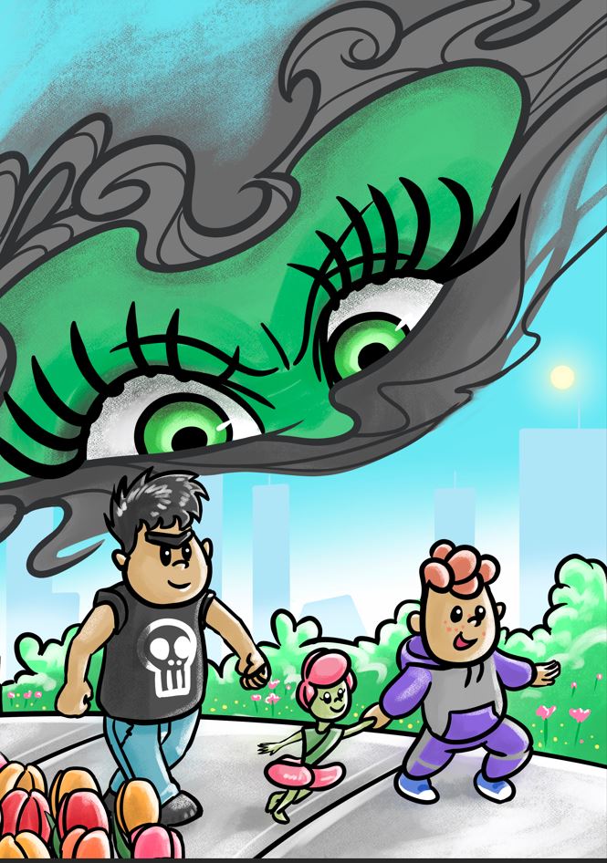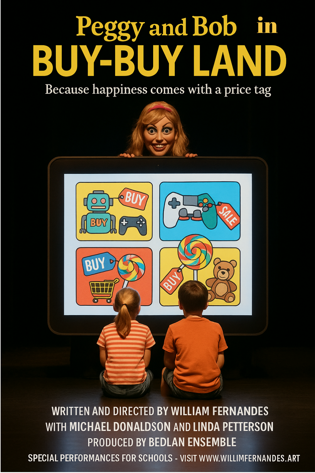Peggy and Bob are just like any other children: they love to play, to run, to get messy, and to invent fantastic stories. But one day, their games are interrupted by a mysterious call coming from a glowing tablet… A voice — seductive and cheerful — beckons them closer. It is Kandy, the glamorous influencer, ready to lure them into the dazzling illusions of Buy-Buy Land.